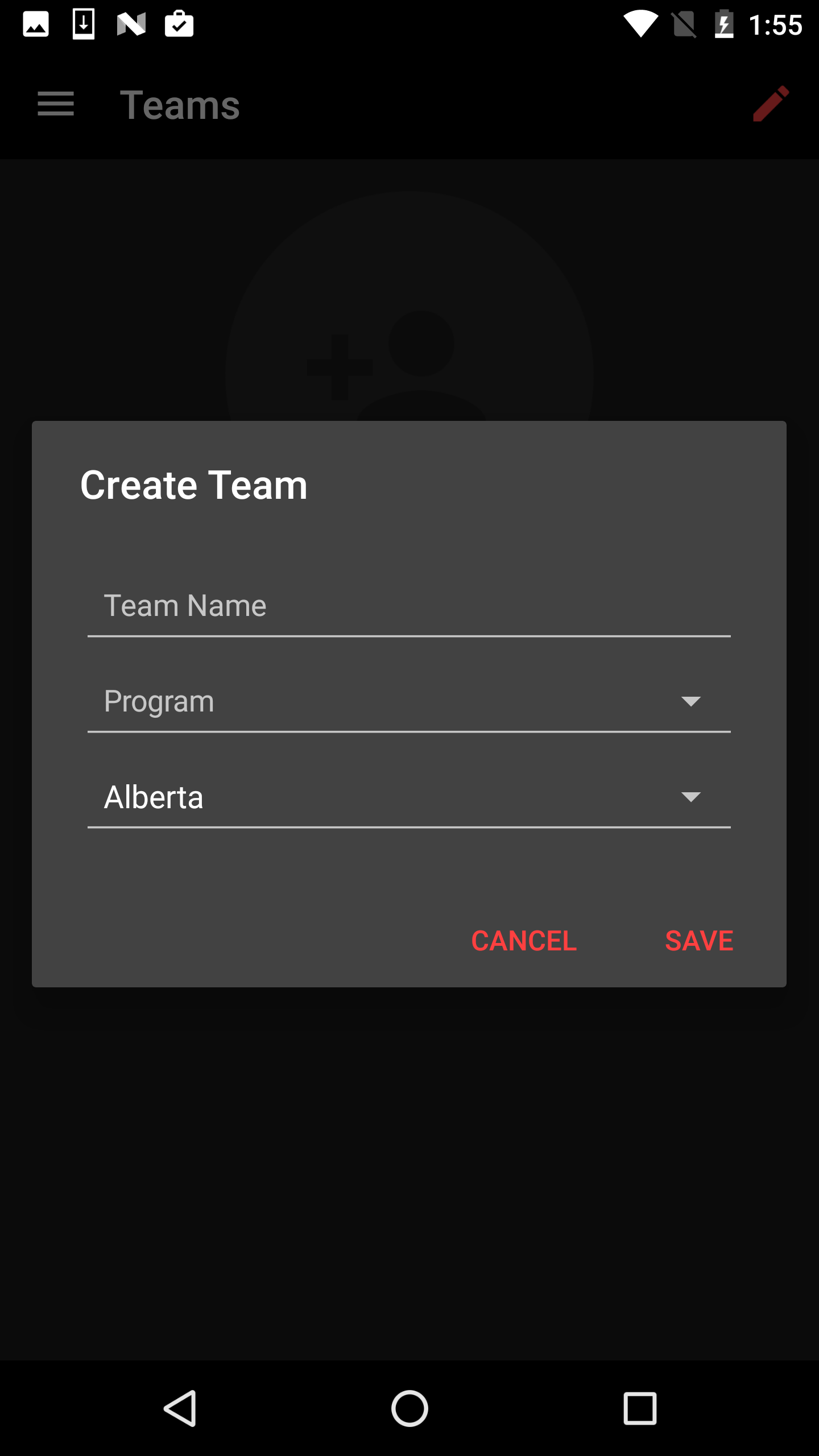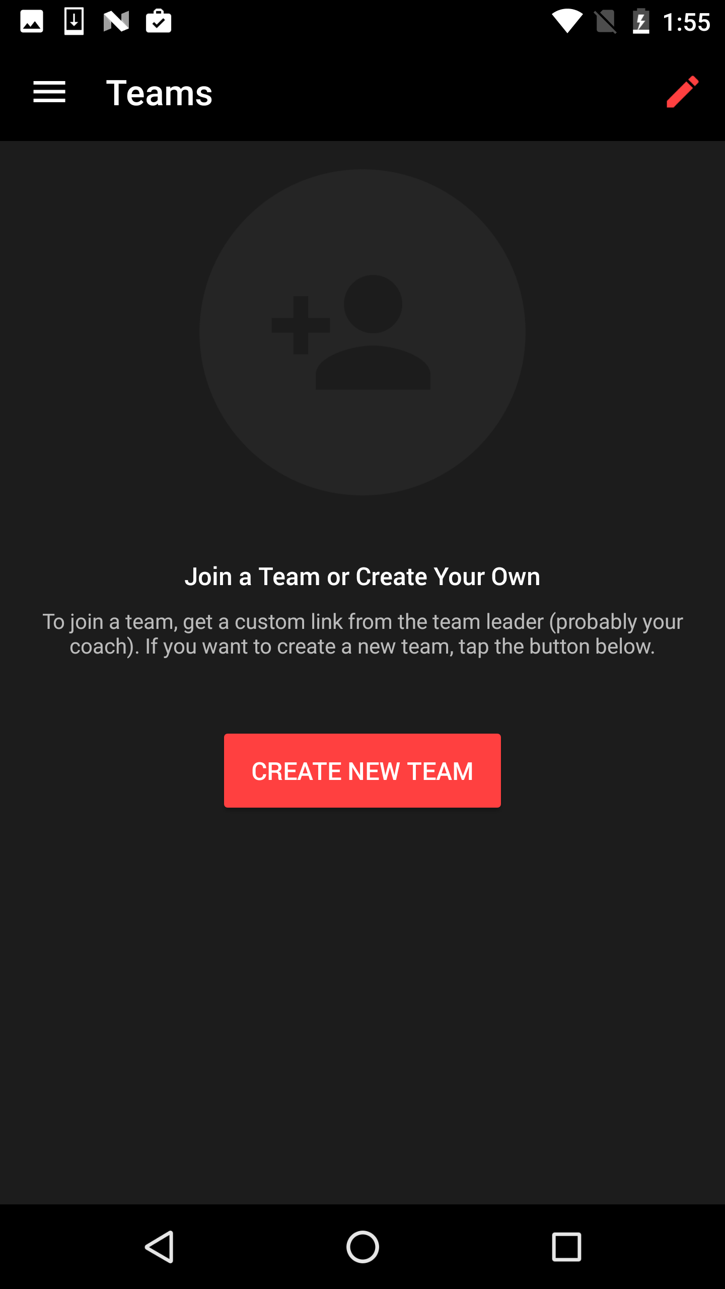 To create a team, open the navigation drawer using the icon in the top left corner.